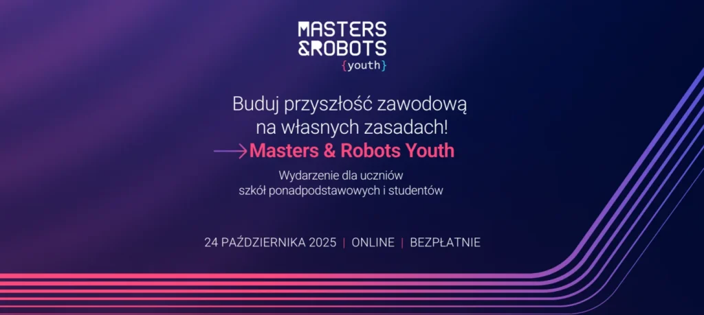 Chcesz poczuć przedsmak Masters & Robots Youth? Dołącz do bezpłatnego bonusowego webinaru „Jak AI wspiera naukę i pomaga odnaleźć pierwszą pracę?”, który odbędzie się 7 października o 18.00. Link do rejestracji: https://events.teams.microsoft.com/event/79369241-b7a6-4a73-a701-0c5545331b96@a99f6862-c627-46ef-8b74-31acff25bf82